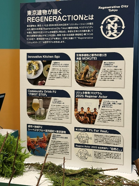 また、東京建物様の展示では、「Regenerative City Tokyo」をテーマに、再生型レストラン「8go」やクラフトビールプロジェクト「FIRST STEP,」、都市と自然の共生を目指す「木庭(MOKUTEI)」などが紹介されていました。